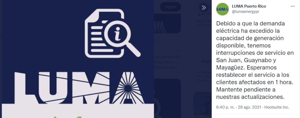 Este domingo, varios zonas de la isla sufrieron interrupciones en el servicio eléctrico motivado a que “la demanda eléctrica excediera la capacidad de generación disponible”. Así lo explicó LUMA Energy, empresa encargada de la distribución y transporte del servicio eléctrico, a través de sus redes sociales.