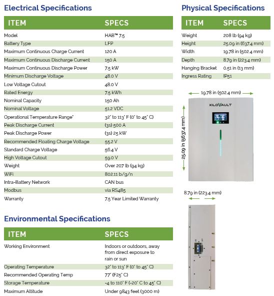 El sistema de almacenamiento de energía KiloVault® serie HAB ™ para montaje de pared, es una batería de 7,5 kilovatios-hora integrada en una sola unidad. Se pueden usar hasta catorce unidades juntas paralelamente, lo que proporcionan hasta 1,2 MWh de almacenamiento al mes para una mayor capacidad de almacenamiento de energía. La serie HAB es compatible con cualquier inversor de 48 voltios y puede almacenar energía de una variedad de fuentes. Cada HAB contiene una batería LiFePO4 no tóxica y térmicamente estable con celdas certificadas UL1642.